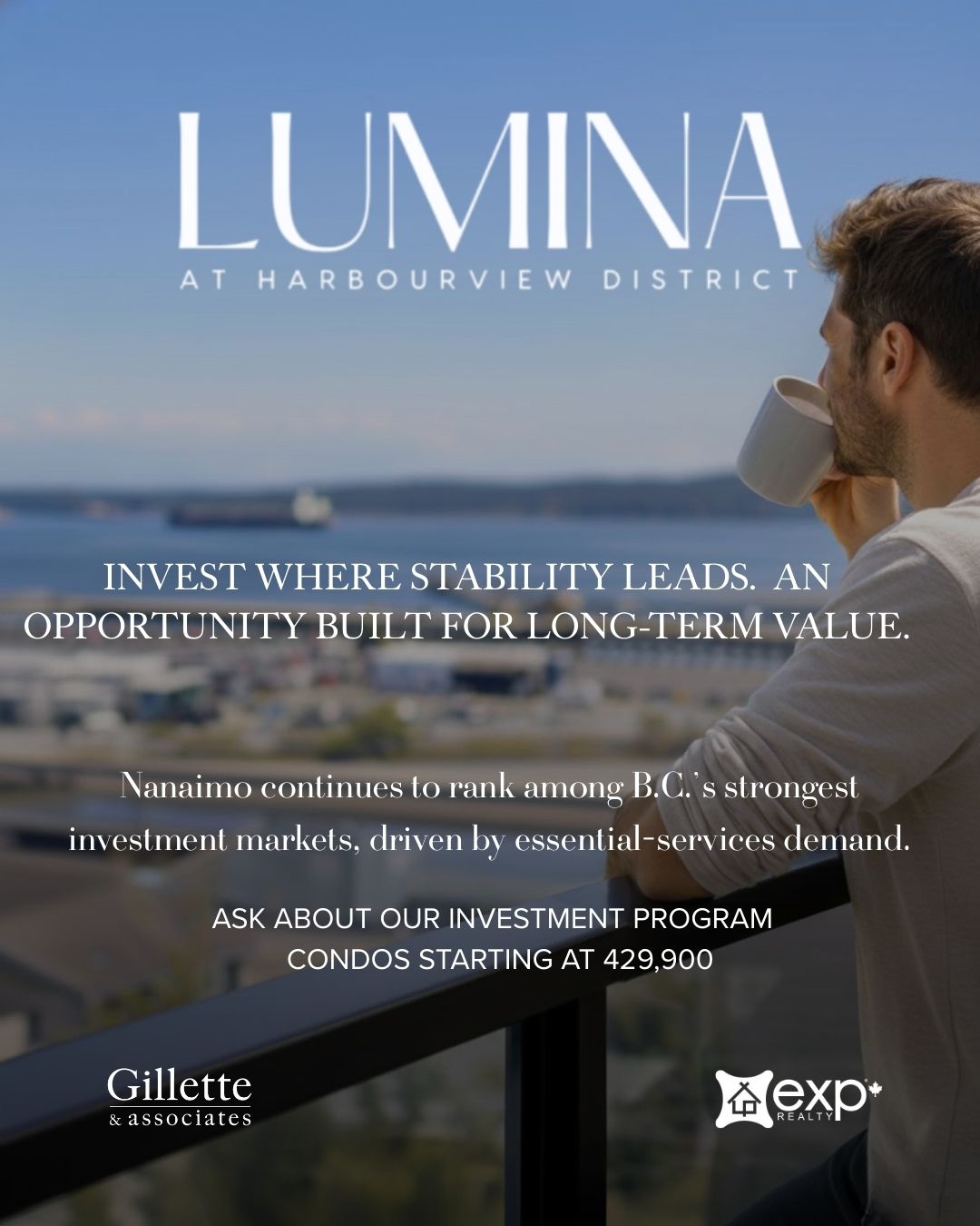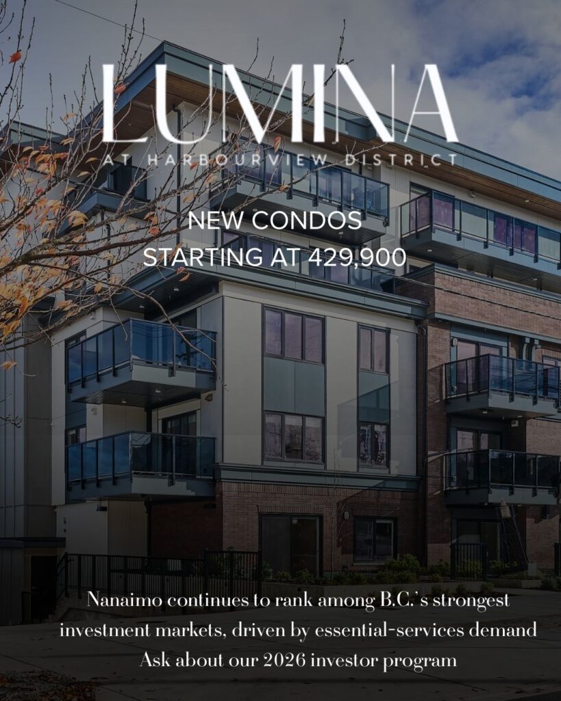Lumina is a brand new, modern residential building located in Nanaimo’s growing Harbourview District. Designed with wellness, walkability, and everyday ease in mind, Lumina brings together contemporary homes, thoughtful amenities, and a connected urban lifestyle near the waterfront.
