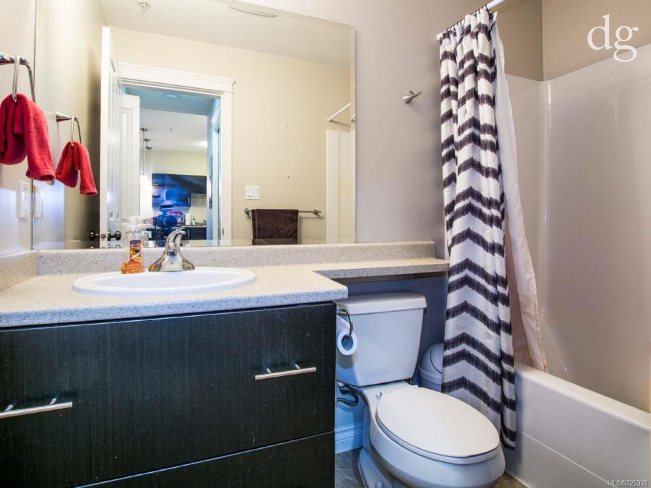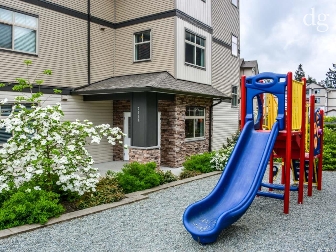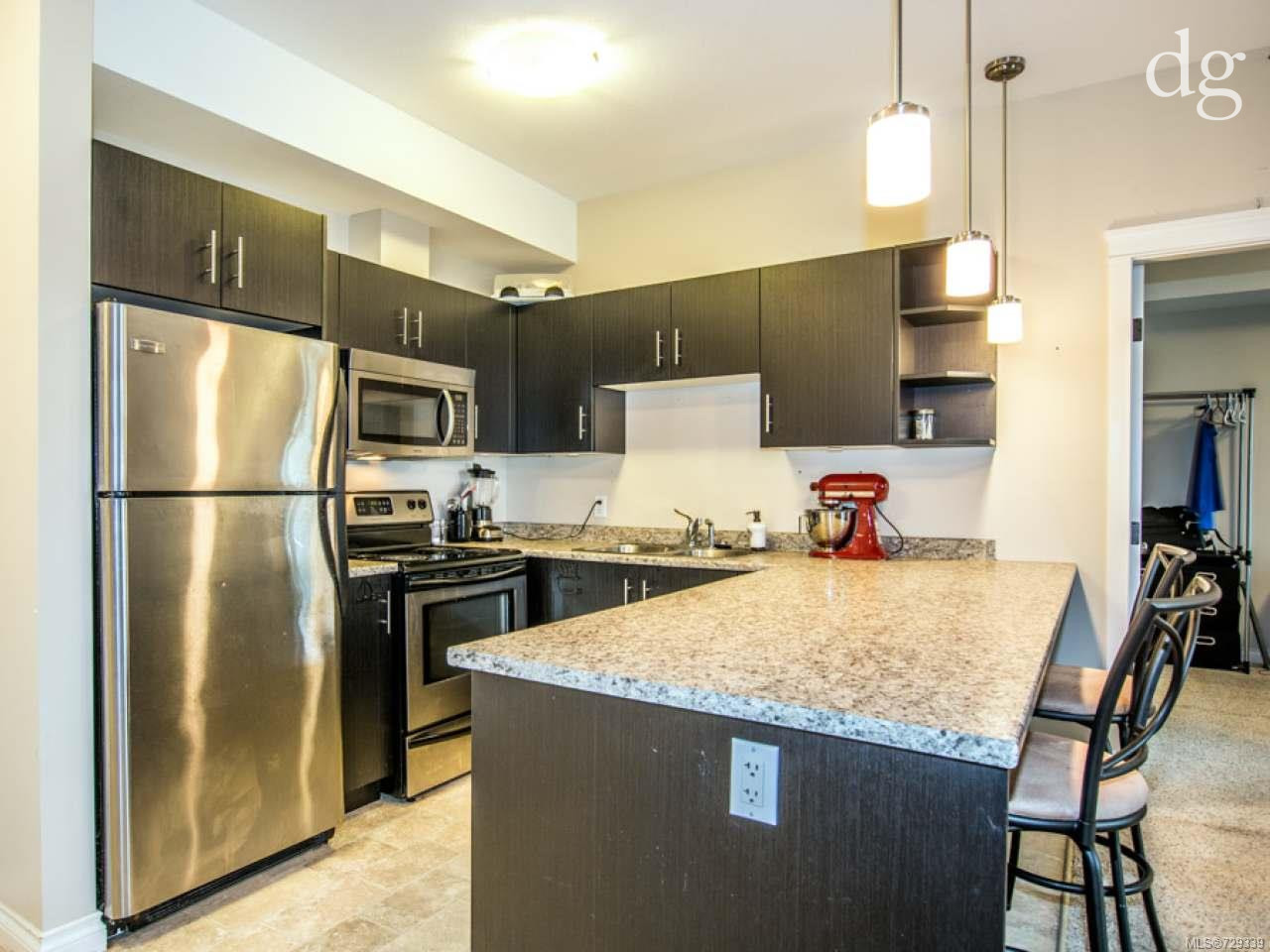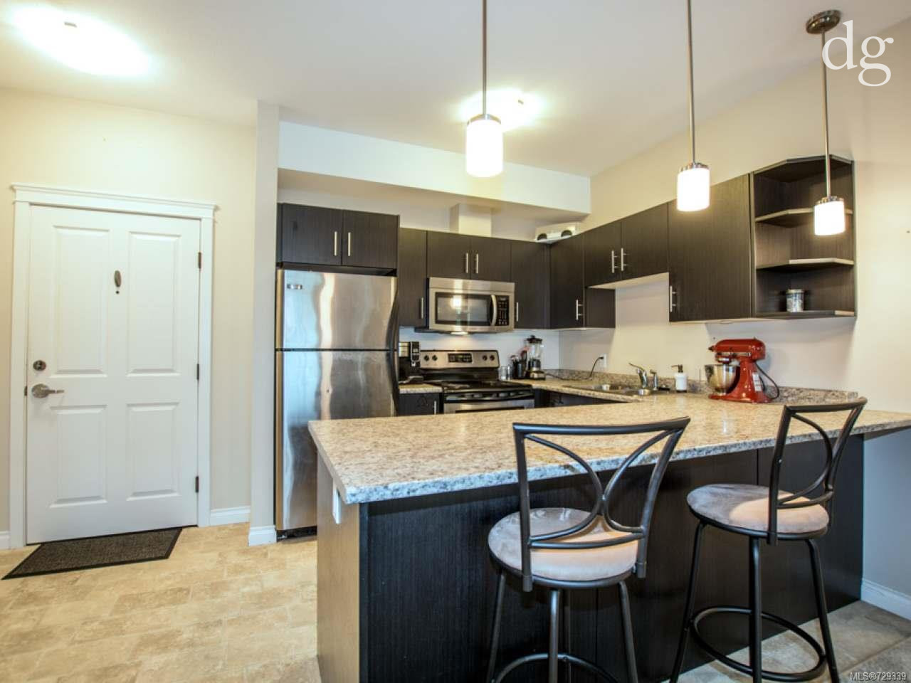 Modern, bright and centrally located this condo is walking distance from shopping, parks and recreation. The 2 bedroom and 2 bathrooms one on either side of the living room to maximize privacy. The floorplan also features 9 foot ceilings, in suite laundry, and balcony. The kitchen nicely appointed with stainless steel appliances, quartz countertops, a useful breakfast bar, and a view of the large living room and cozy electric fireplace. Owners can also make use of the the well-appointed clubhouse with 2 stores of amenities including a full kitchen for large gatherings with friends & family, an equipped fitness room, furnished TV & sitting area with a fireplace & games table and beautifully offering playground for the kids. Rentals ok, pets ok with some restrictions. All measurements approximate and should be verified if important.