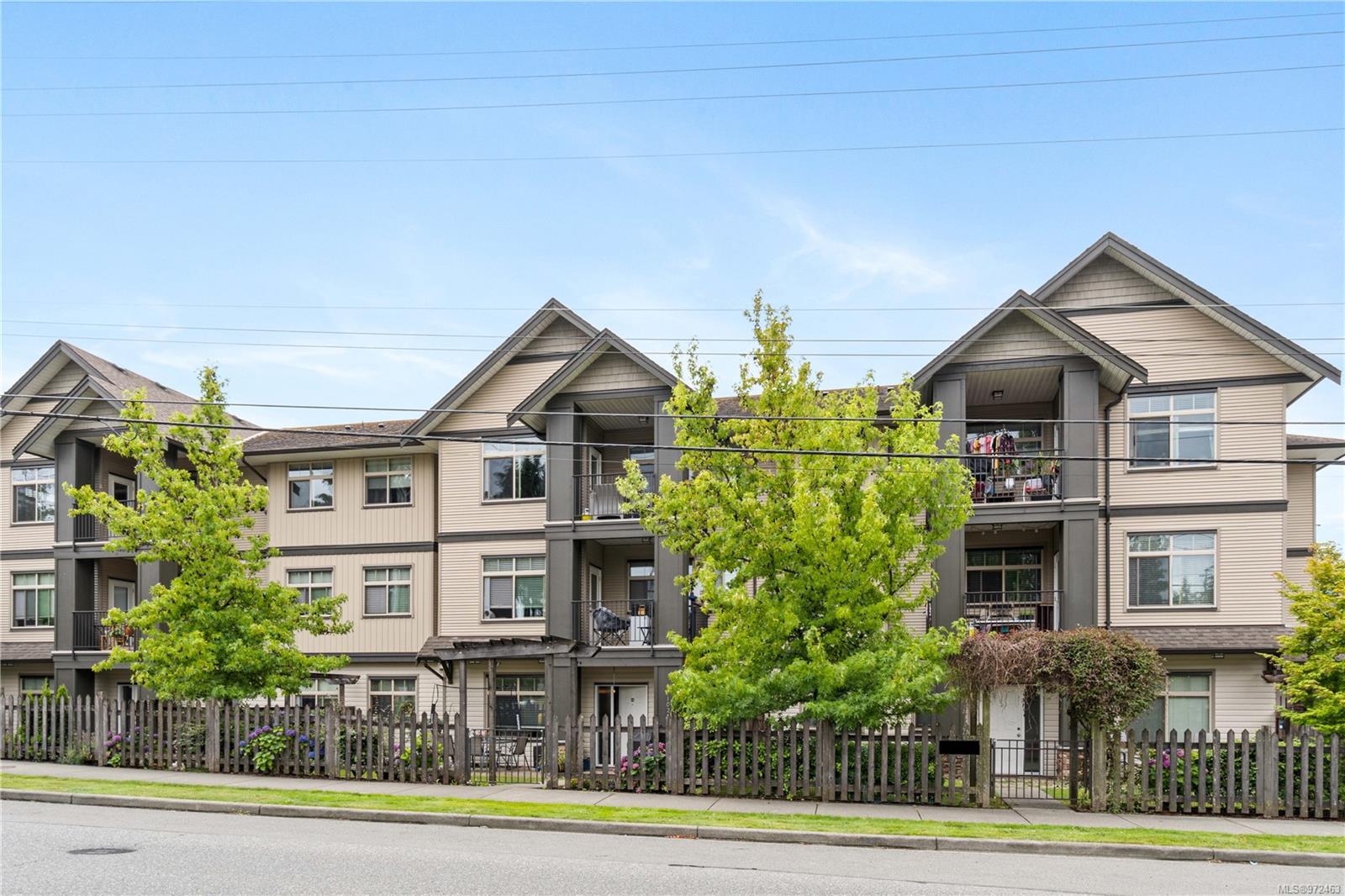 The floorplan boasts 9-foot ceilings, in-suite laundry, and a balcony, providing ample space and comfort. The kitchen is beautifully appointed with stainless steel appliances, quartz countertops, and a useful breakfast bar, all overlooking the spacious living room with its cozy electric fireplace.