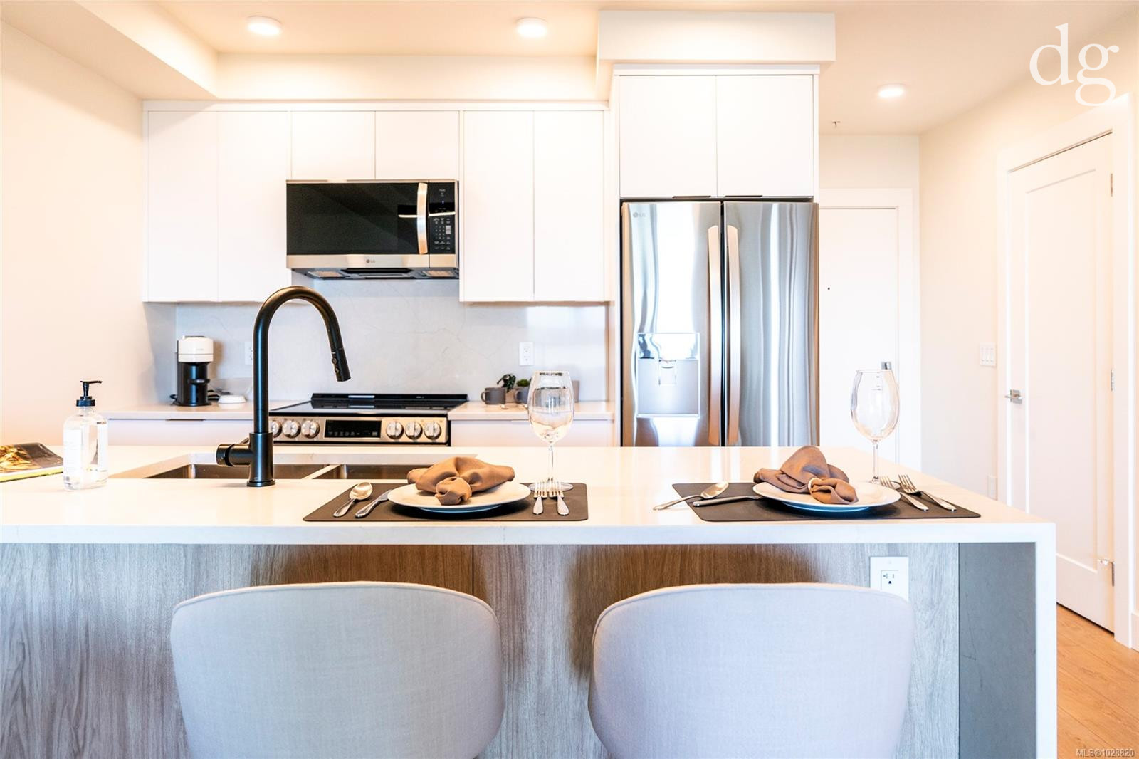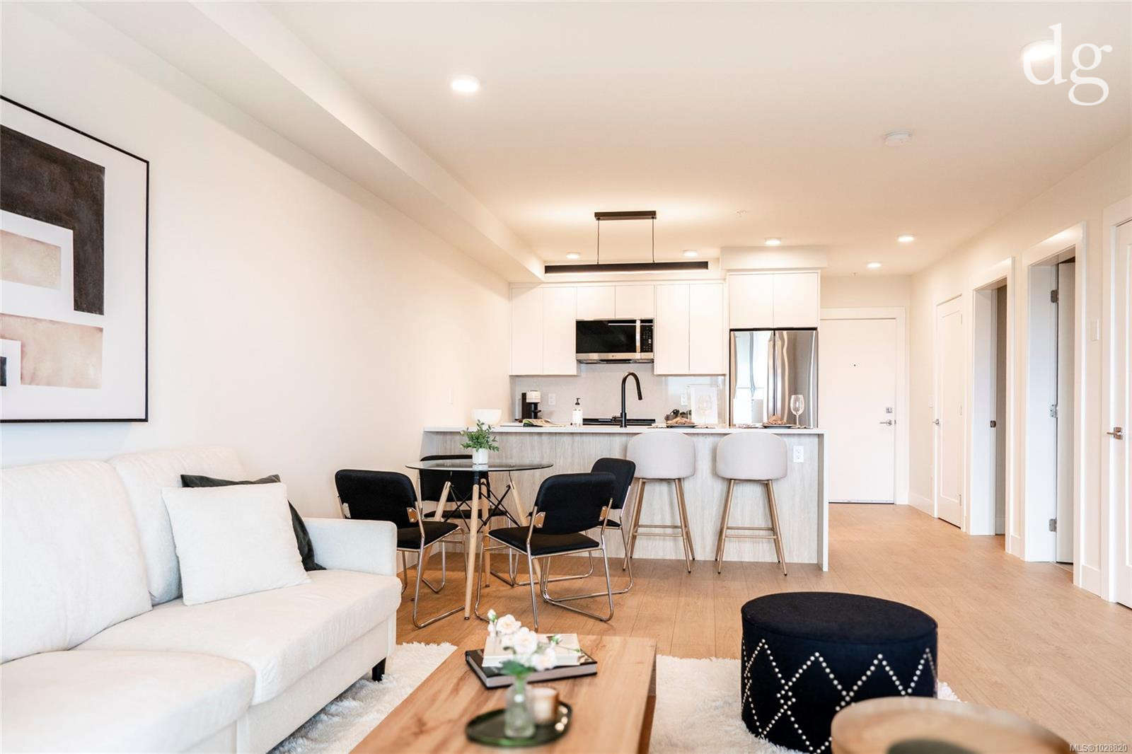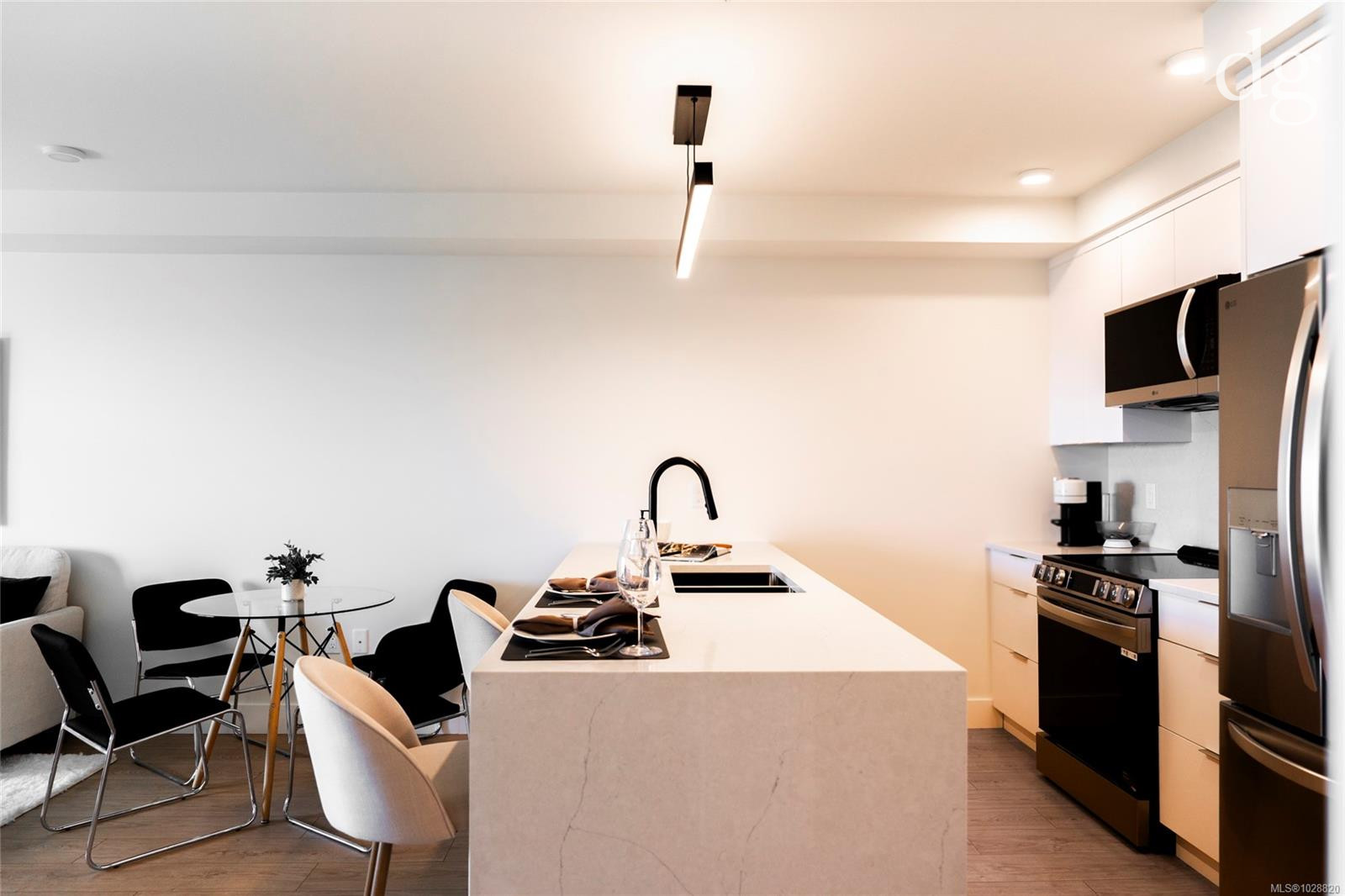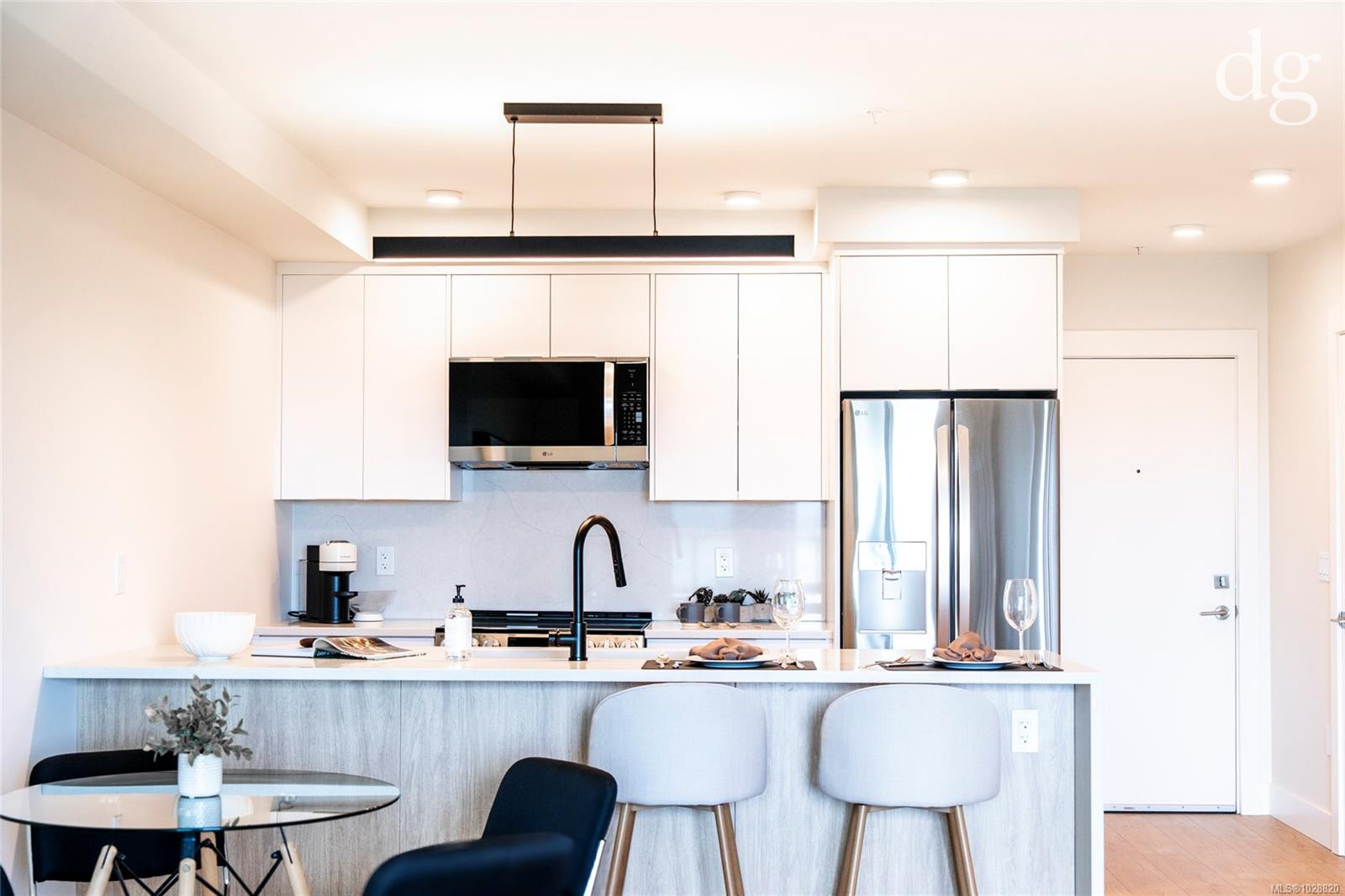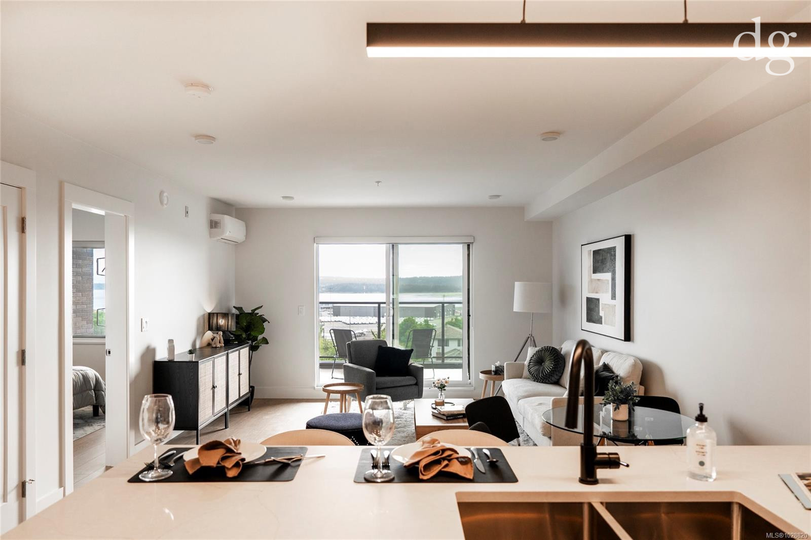 Welcome to Lumina in Harborview District, another principal property community in the heart of downtown Nanaimo, where city living meets coastal charm. Steps from the harbourfront, seawall, cafés, shops, parks, and Hullo Ferries, Lumina places you in the center of a growing, evolving district. Enjoy your mornings on the rooftop patio surrounded by lush greenspace and expansive ocean views. This beautifully designed 2-bedroom, 1-bath home features bright, open living with views of the harbour, city, and mountains — a striking blend of coastal beauty and urban energy. The kitchen stands out with waterfall-edge countertops, sleek cabinetry, and contemporary lighting, all contributing to a clean, modern aesthetic. Whether it’s a stroll along the waterfront, coffee with friends, or a rooftop sunset, this home connects you to the best of downtown — and the exciting future unfolding around it.
