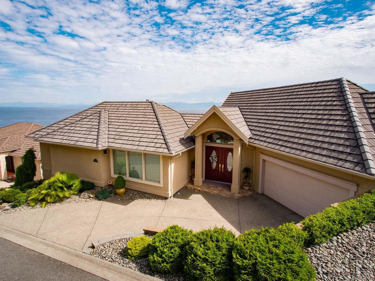 This stunning custom-built waterfront home is nestled in a gated community; it offers 3873sf of living space, infinite ocean views a timeless design, elegant decor & expansive windows. The living rooms has carpeted flooring & gas fireplace with marble surround. The dining room is accented by a chandelier to complement the 17' ceiling. The island kitchen has a raised bar counter, door onto deck, cherry wood cabinetry, gas range, double ovens & warming drawer. An eating nook with sunrise view adjoins a large family room with gas fireplace. The master features Swarovski crystal chandelier, walk-in closet & ensuite with jetted tub overlooking the sea, steam shower, dual sinks & heated floor. Additional main floor features include a built-in media system, curved staircase to the open gallery & bonus room, level access to garage, rear patio & to the deck which captures the sweeping views. All measurements are approximate & should be verified if important.