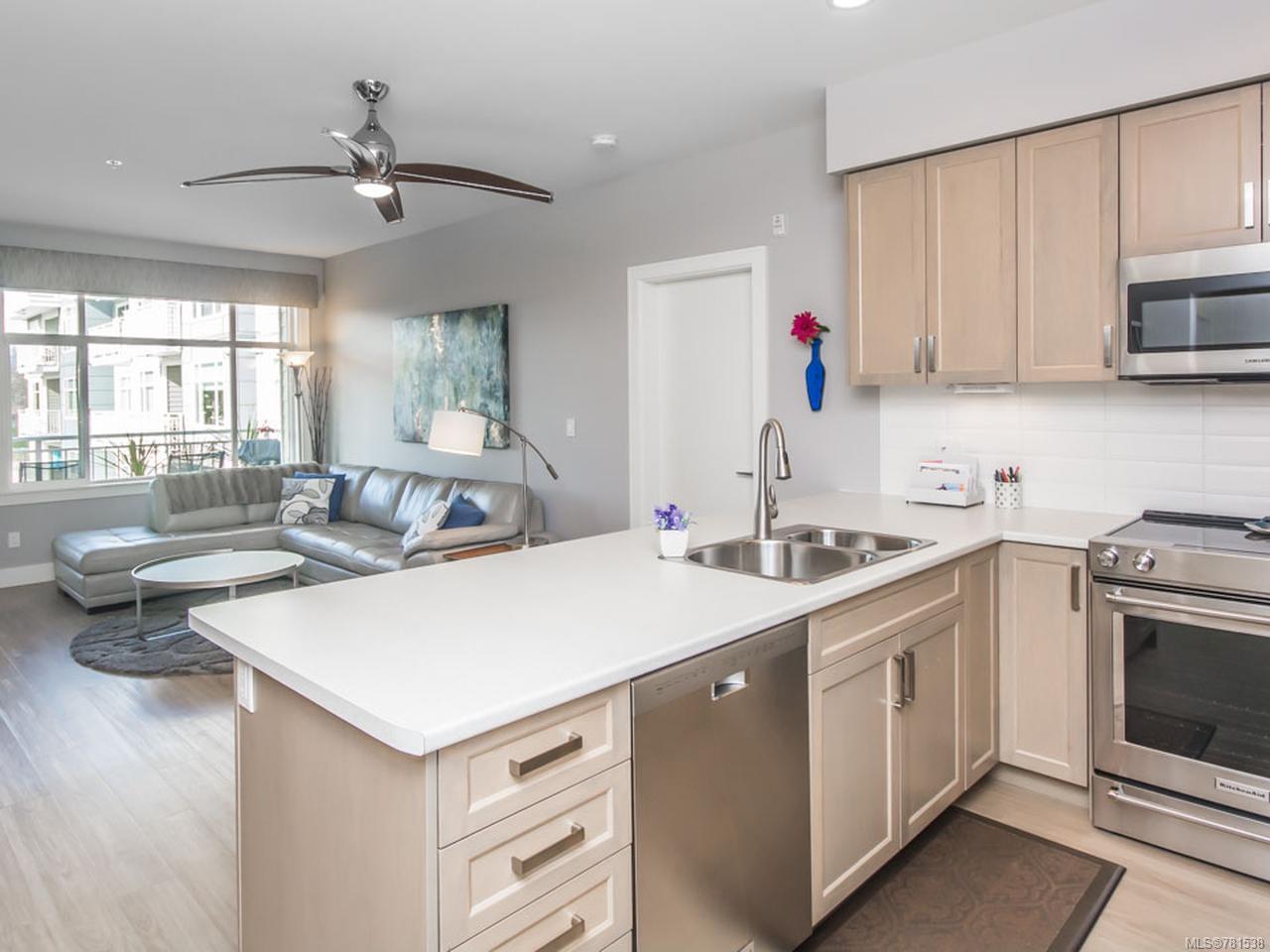 Contemporary 2 bedroom and den condo conveniently located in North Nanaimo near amenities and major bus routes. This light and airy open-concept living space features 9 foot ceilings and has been tastefully upgraded with LED lighting throughout, new countertops with extended eating area, sinks, faucets, stainless appliances, garbage disposal, ceramic tile backsplash, under counter lighting, ceiling fans and more. The guest room boasts a custom Murphy bed and the den has been outfitted with custom shelving to keep you organized. You will love the mountain views and adjacent marsh bursting with wildlife which can be enjoyed year round from a covered deck. Additional features include: large windows, secured underground parking, custom window treatments, custom closet organization, in-suite laundry and secure storage. All measurements are approximate, verify if deemed important.