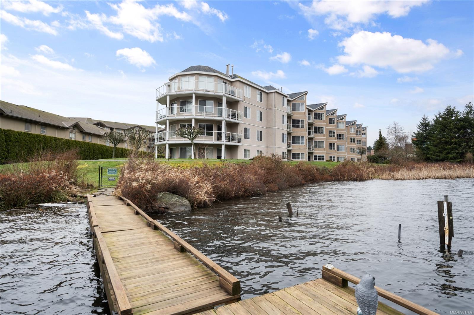 New price at Lakeside Villa! This 2 BD, 2 BA well maintained unit has an extensive view of Long Lake & southern exposure. Features include an open concept kitchen, dining & living area, in-suite laundry & easy-care laminate flooring throughout. Enjoy morning coffee on your sunny patio & take in the views of the entire length of Long Lake from your living room. Outside features beautiful landscaping & a private dock to launch your kayak or swim (kayak storage available). The primary bedroom has a full ensuite & walk-thru closets. The 2nd BD has french doors, which makes its use flexible. Convenient location! Just a short walk away from North Nanaimo Town Centre, restaurants, transit & many other amenities. Fresh paint, cleaned & ready for new owners. Condo living at its best & still an affordable option. Min. age is 19, pets & rentals are allowed w/ number limit, not size. Vacant with immediate possession available! All measurements are approximate & should be verified if important.