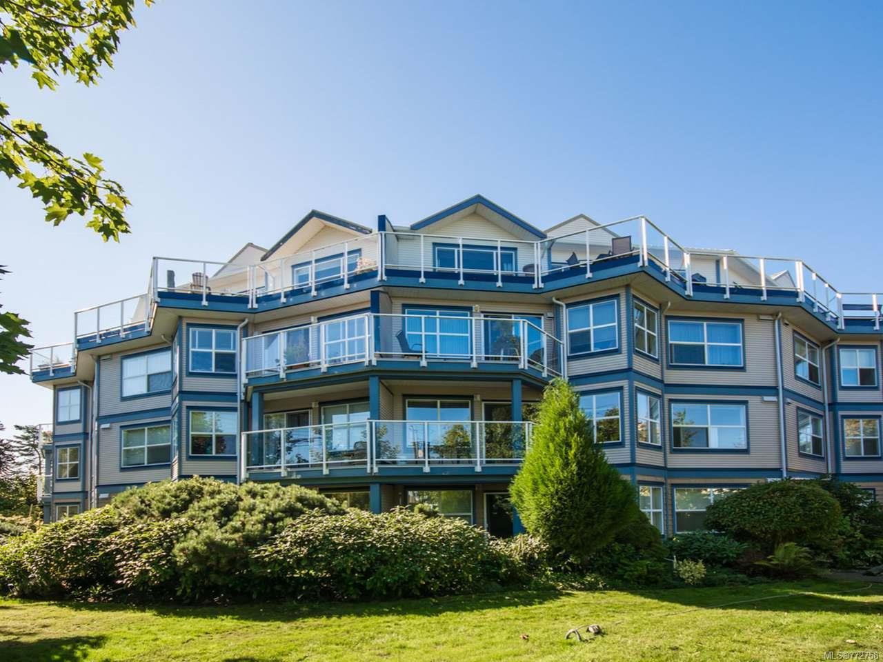 Elegant penthouse overlooking the harbour & coastal mountains. This home features two large decks for outdoor entertaining, one spanning the length of the condo. Burmese teak flooring and Italian glass pendant lights provide touches of luxury, & the gas fireplace with copper surround and wood mantel is a lovely centerpiece that provides warmth and effortless style. The open-concept kitchen/ living area welcomes with sweeping views and plenty of natural light from double skylights. Custom cabinetry in the kitchen provides plenty of storage, and the oversized island can double as a prep space and bar area. If you don't feel like cooking, a quick stroll takes you to some of the best cafes and restaurants in town. In addition to the listed square footage is a double garage/shop, plus three parking stalls. Conveniently located near shops, amenities, downtown & the parkway. All measurements & data approximate. Verify if important.