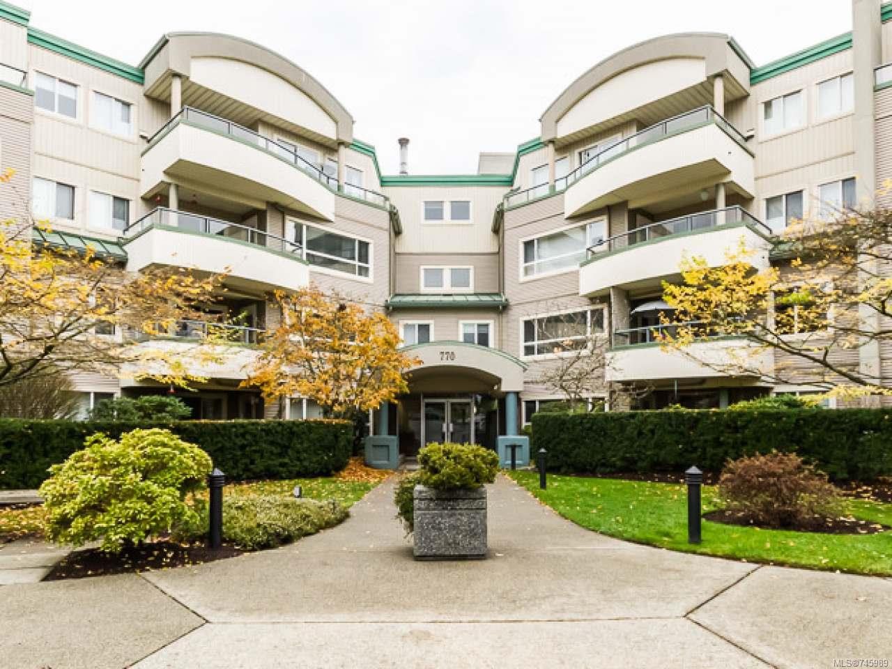 Accepted offer with subjects removed over holiday weekend.This spacious 3 bedroom, 2 bath condo is the largest unit in the Poplar building and has been newly painted this past spring in neutral tones. The newly renovated modern kitchen is finished with subway tile backsplash, new countertops, cabinets and eating bar that opens to living room. Enjoy the view of Mt. Benson in the living room warmed with natural gas fireplace. Plenty of storage throughout, and an additional storage locker is included. The covered patio with access from bedroom as well as living room overlooks the landscaped grounds and mountain. The master bedroom includes a private ensuite bathroom and in unit laundry is off of the main bathroom. Building security provides live feed video cameras at main entrance and underground garage to both buildings which occupants can view on their own TV. Strata fee also includes natural gas. New window coverings in all rooms except for center bedroom. Lighting updated to LED.