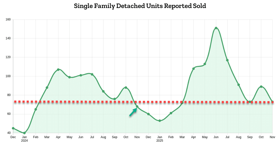In this Nanaimo market report for November 2025, the single-family segment shows steady and disciplined activity. Based on the latest VIREB Graphstats report, November recorded 95 new single-family detached listings in Nanaimo and 73 completed sales—roughly a 7% increase year-over-year.